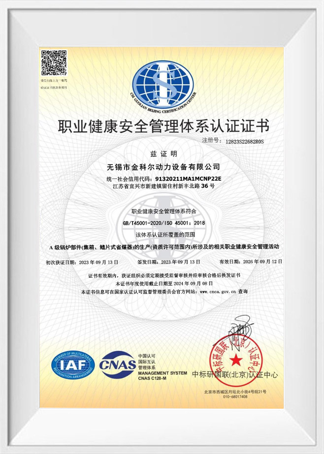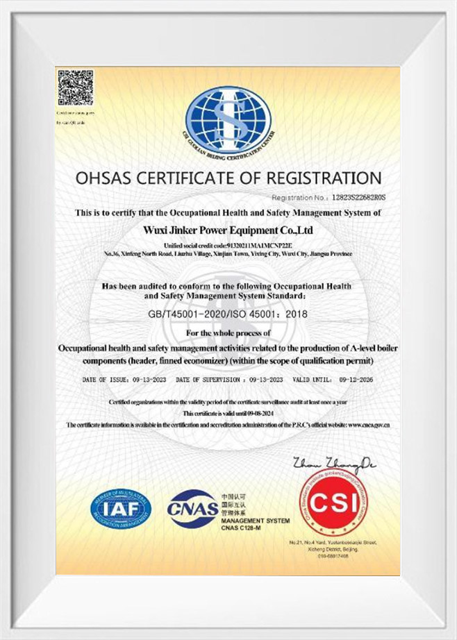Nous sommes une entreprise avec une licence de fabrication pour les pièces de chaudière de niveau A (en-tête, économiseur de combustible), une entreprise de qualification ASME-S, ISO9001、ISO14001、ISO45001、ISO 3834-2.